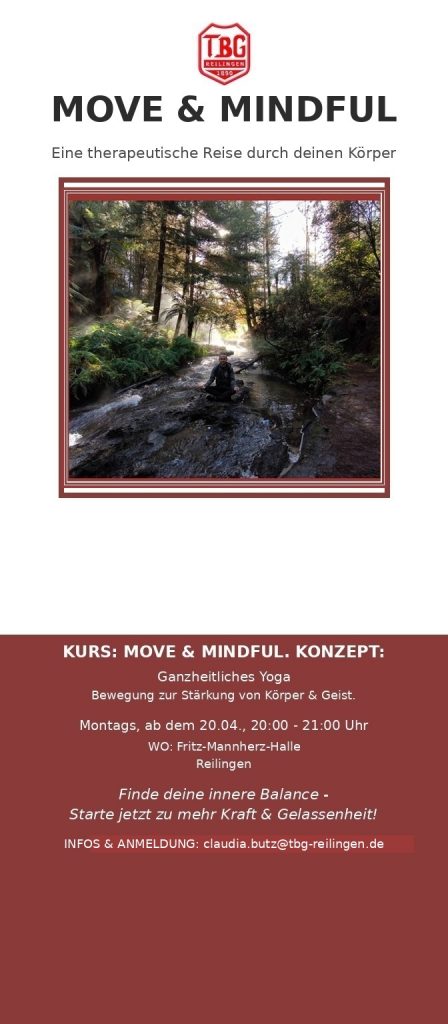 Neues Kursangebot beim TBG für junge Erwachsene, die bei Rückenverspannungen, Stress im Alltag oder einfach das Bedürfnis nach einem körperlichen Ausgleich suchen. Der TBG startet mit “Move&Mindful” ein Programm, das speziell auf die Bedürfnisse von jungen Erwachsenen ( ca 20 – 40 Jahre) zugeschnitten ist.
